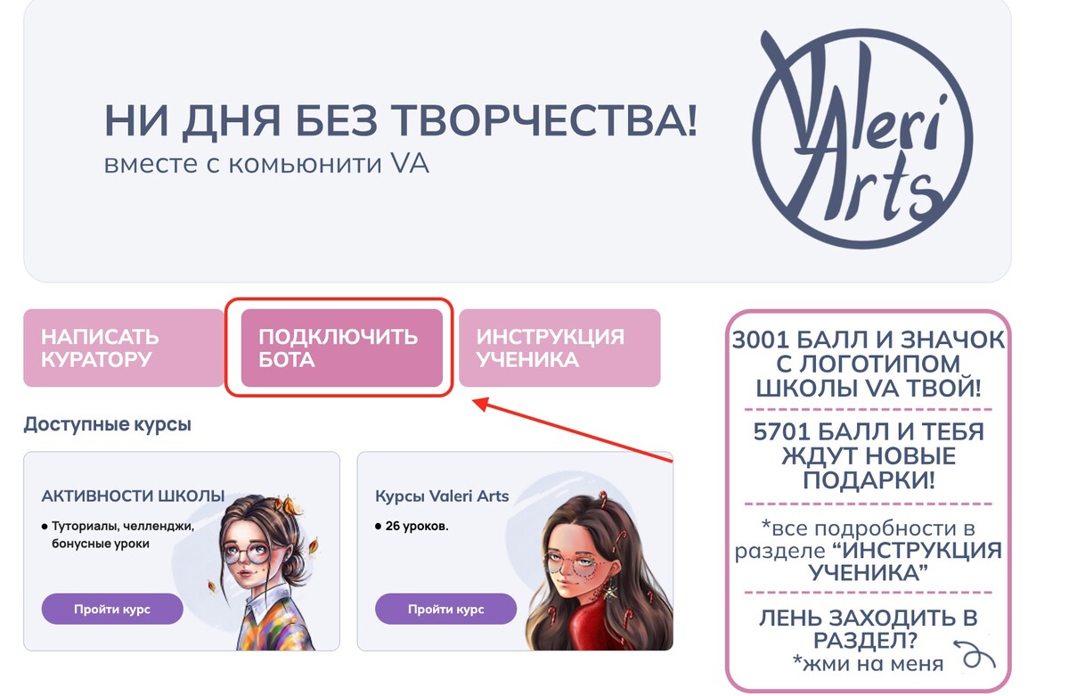 Без подключения бота вы не сможете вступить в чат учеников. Также бот будет присылать вам уведомления о проверке ДЗ и важные новости школы. Чтобы его подключить, зайдите в раздел "Тренинги" https://valeriarts.ru/teach/control/stream и нажмите на кнопку "ПОДКЛЮЧИТЬ БОТА"